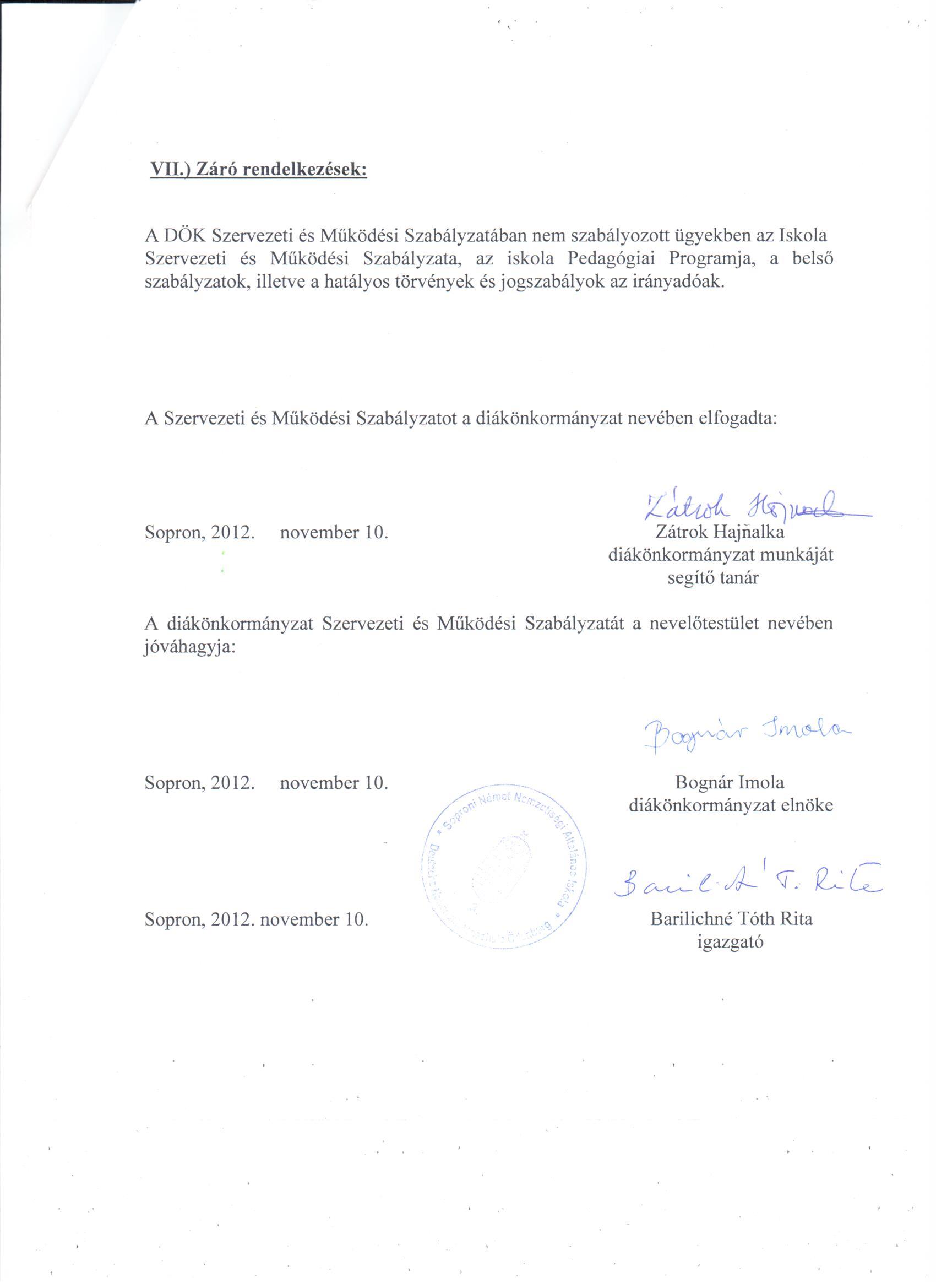 – A diákönkormányzat vezetőségének kötelessége, hogy személyi döntéseit a Szervezeti és Működési Szabályzat, valamint az éves munkaterv elfogadása előtt kikérje az õt megválasztó tanulóközösségek, tanulók véleményét.